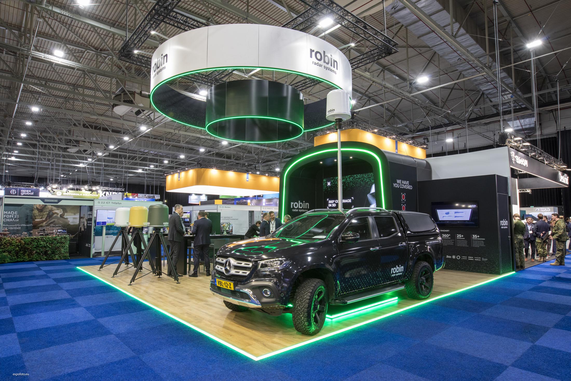 Centraal in het ontwerp stond het thema ‘IRIS UNCOVERED’, fysiek vertaald naar de grote IRIS-boog met geïntegreerde bar. Deze opstelling nodigde bezoekers uit om letterlijk de wereld van Robin Radar te betreden. Door deze boog tevens in te zetten als podium voor kennissessies, werd de diepere techniek achter het systeem op een toegankelijke manier inzichtelijk gemaakt.